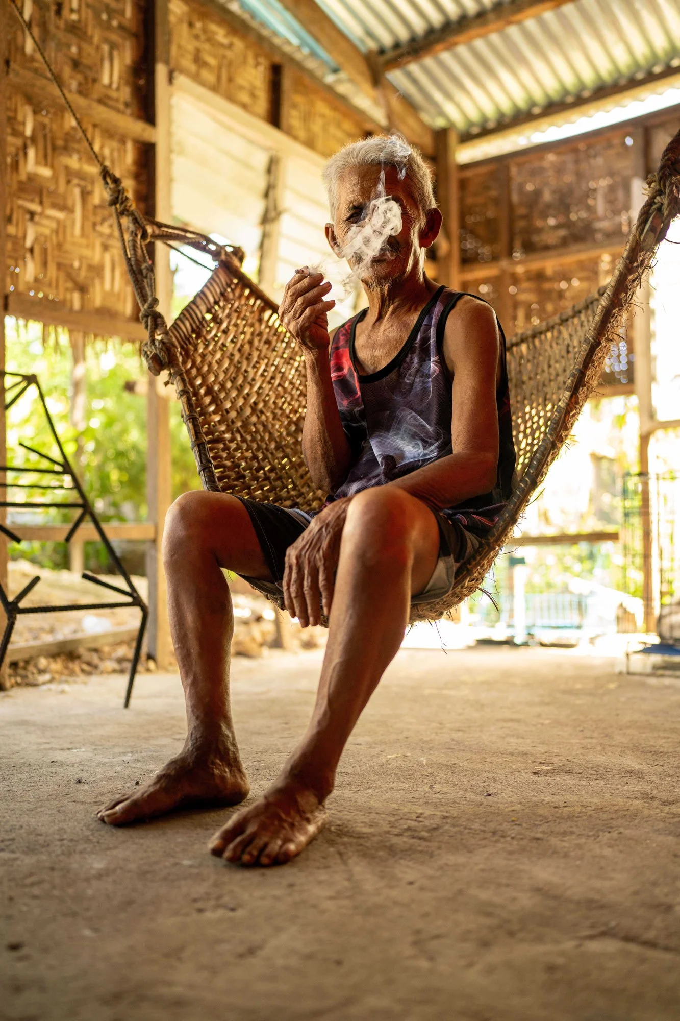 Gallardo, a mangkukulam or healer smokes in his home, Siqujor, Philippines.